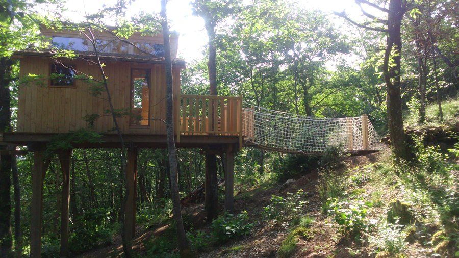 Sitting 5m high and accessible via a rope bridge, la Cabane du Haut is a family cabin on stilts with 2 areas linked by a...