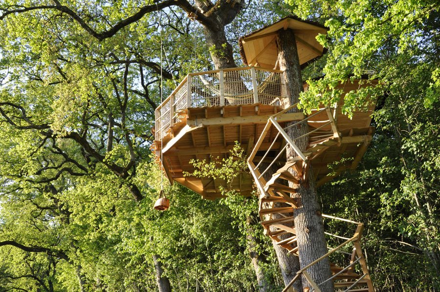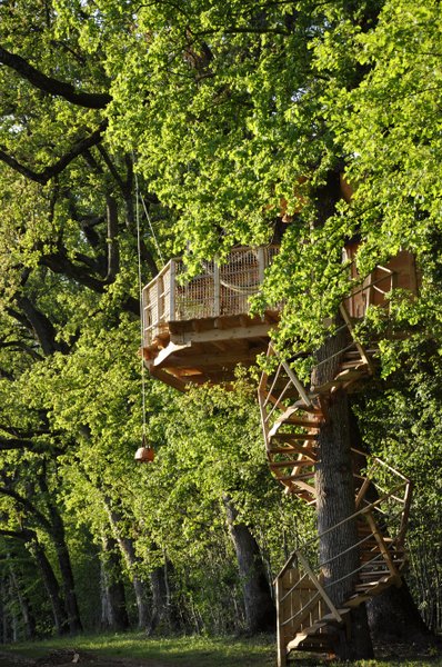 A 5 metros de altura, sobre un roble centenario, esta cabaña está accesible por un escalera de caracol.