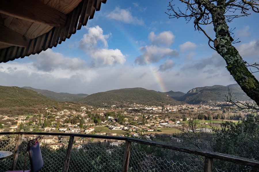 Cabane L'Envol du Phénix : accédez à cette cabane unique par un escalier façonné dans un tronc d'arbre, qui mène à une c...