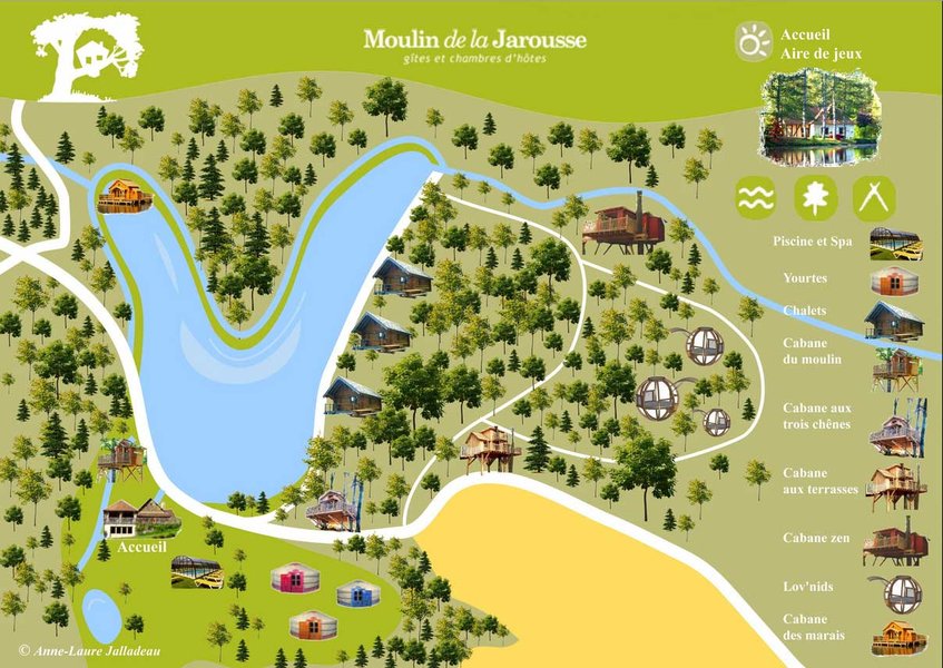 De Moulin de la Jarousse is een camping met ongebruikelijke accommodaties in de regio Dordogne. In het hart van de Périgord Vert, midden op het platteland en de ongerepte natuur, biedt het landgoed Moulin de la Jarousse diverse ongebruikelijke verblijven die perfect in hun omgeving zijn geïntegreerd met betrekking tot ecologie en duurzaam toerisme.