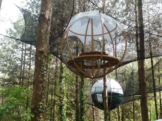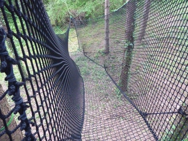 Het "nest" Hiboux 2 is gespannen op een hoogte van 5 à 6 meter. Om er te komen loop je via een "loopnet", dit geeft direct een gevoel van vrij te zijn uit de dagelijkse sleur.