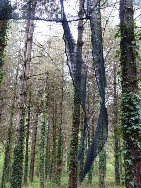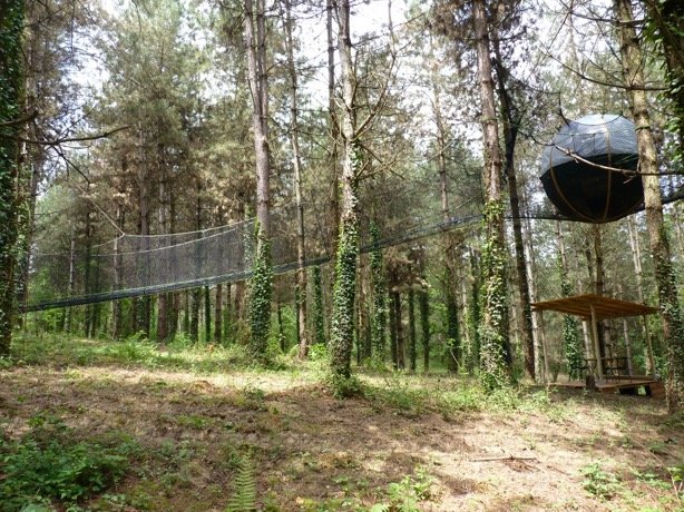 Het nest "Les Palombes" is verstopt tussen de dennebomen en ligt op 6 meter hoogte, je kunt hier heerlijk genieten van de rust. Het nest is toegangelijk via een loopbrug van netten . Rond het nest is een catamarannet van 20m2 gespannen zodat je vrij kunt bewegen rond het nest.